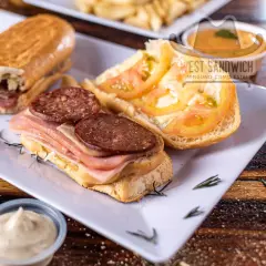 Jamón ahumado, jamón cordero, salami, queso, lechuga, tomate y salsa de ajo.