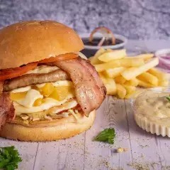 Carne angus, queso cheddar, piña, cebolla morada, tocineta, lechuga y salsas.