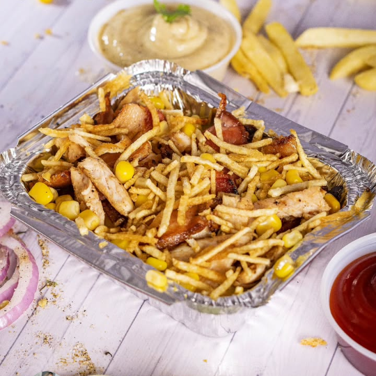 Filete pollo ( 100 gramos), maicitos, tocineta ( 3 tiras picadas de cuadros), queso mozarella ( 6 lonchas) papas chips trituradas y salsa de ajo, sin papas a la francesa y sin bebida.