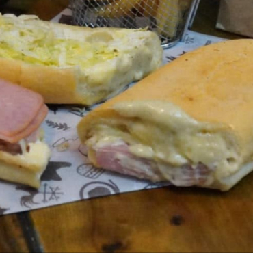 Sandwich de con pan frances artesanal de 35 cm, Jamón, queso, piña y salsa de ajo. Maximo para 2 personas.