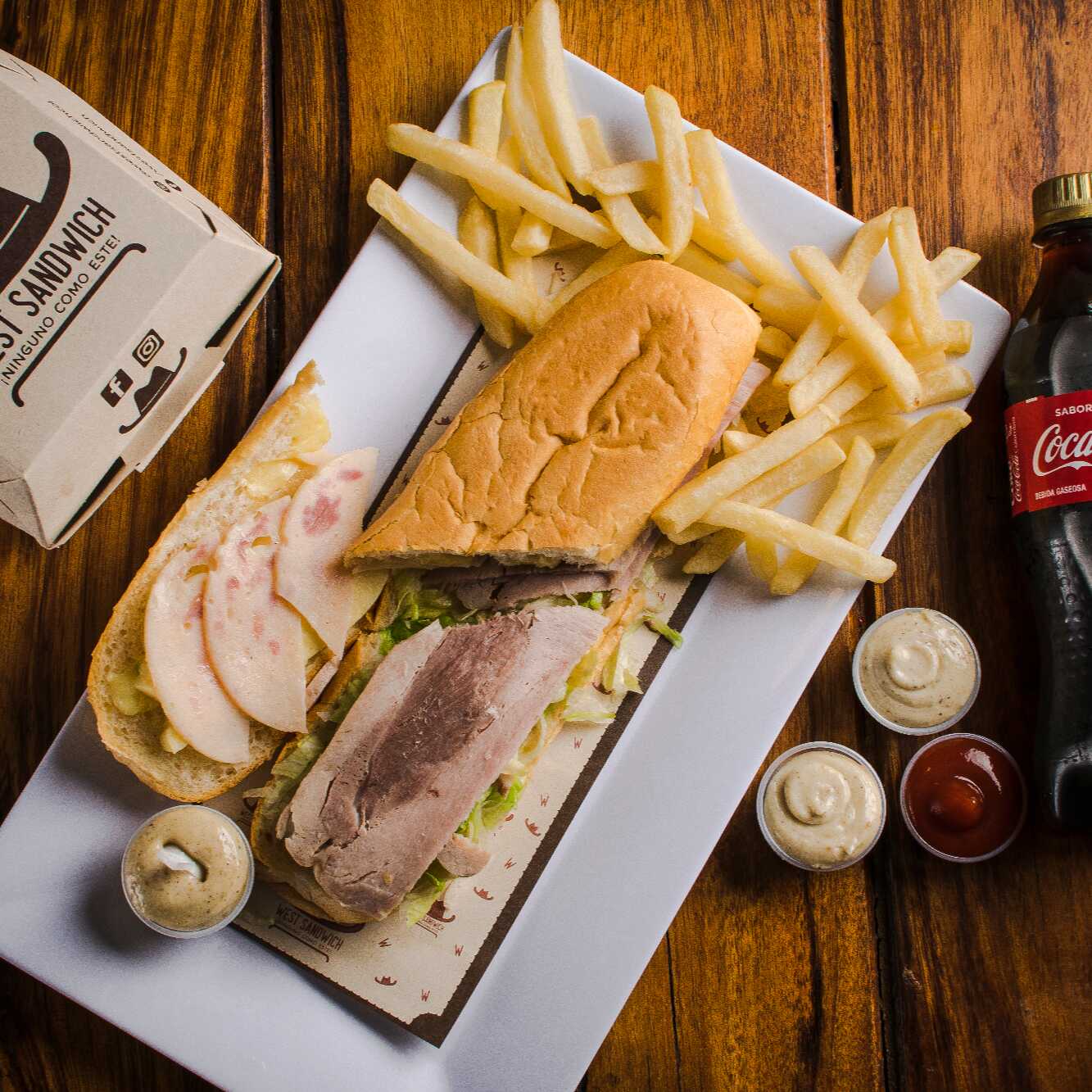Cordero pierna, jamón, cordero, queso, lechuga, salsa de ajo.