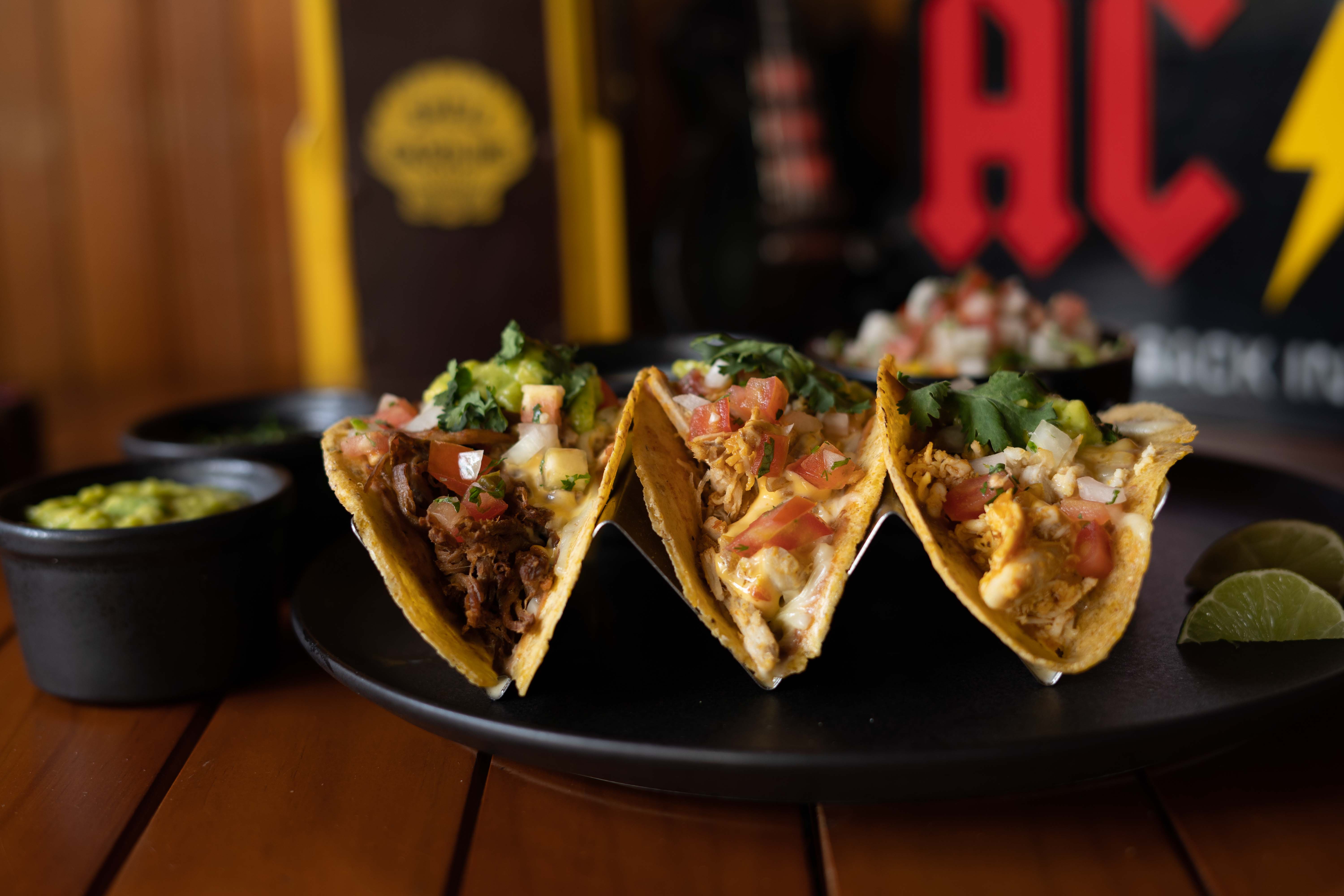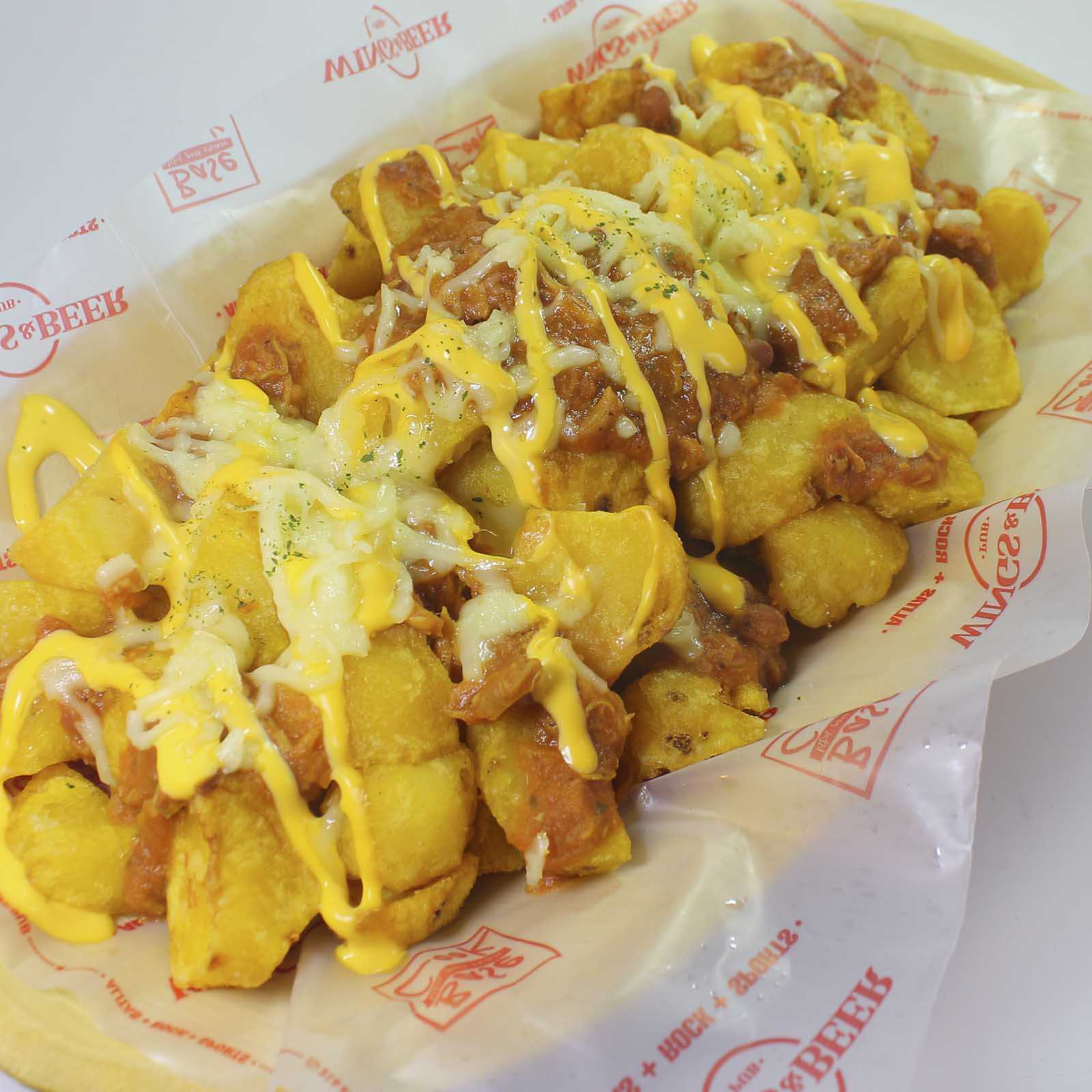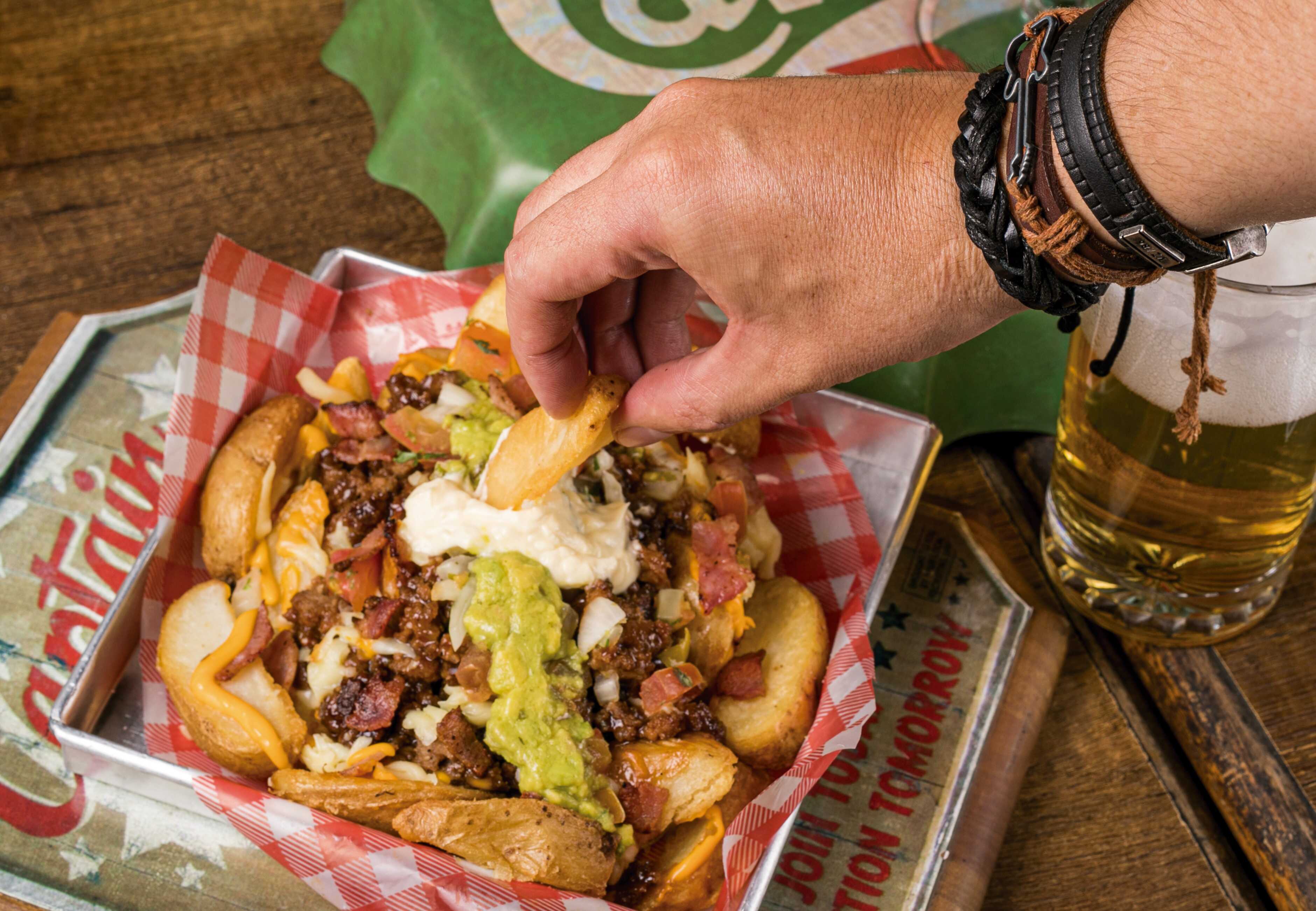 Papitas en cascos, criolla, francesas, carne desmechada, chilli con carne, queso cheddar, queso mozzarella, guacamole, sour cream, pico e gallo.