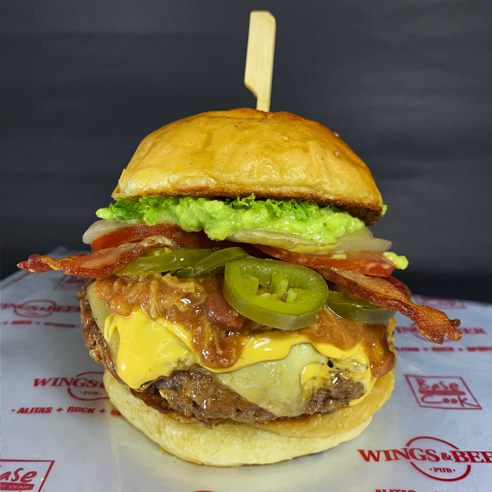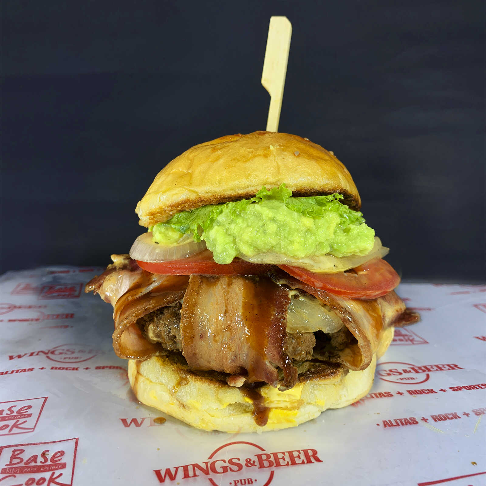 Pan artesanal, carne certified angus beef envuelta en tocineta, queso americano, queso mozzarella, salsa BBQ, guacamole, vegetales, sin papa.