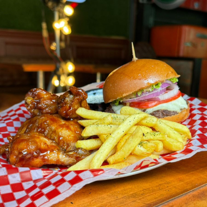 Pan artesanal, carne certified angus beef braseada en salsa de la casa, tocineta, queso americano, queso mozzarella, vegetales, sin papa.