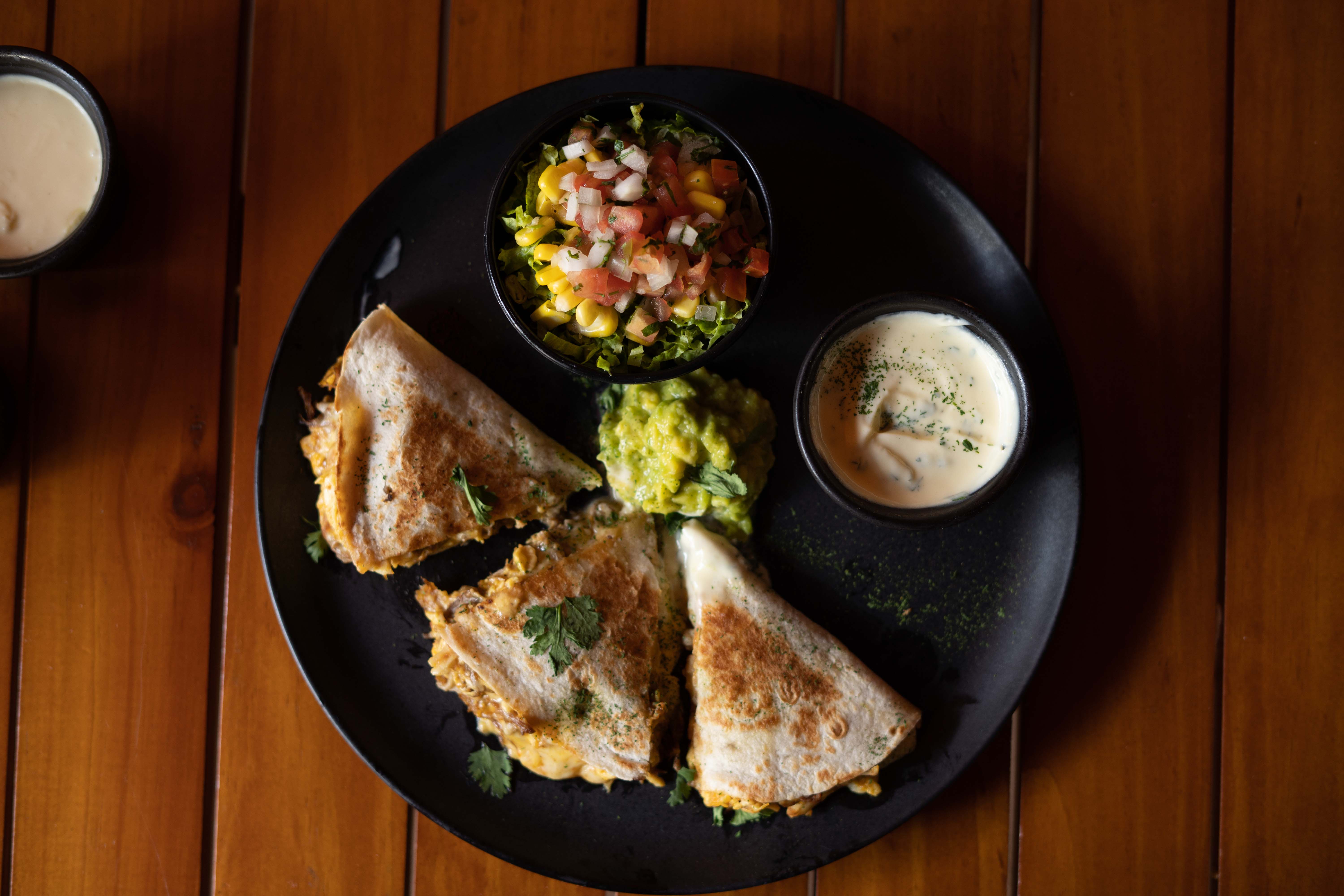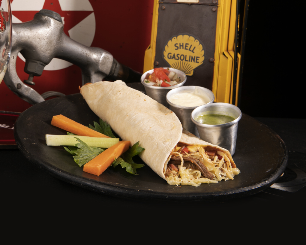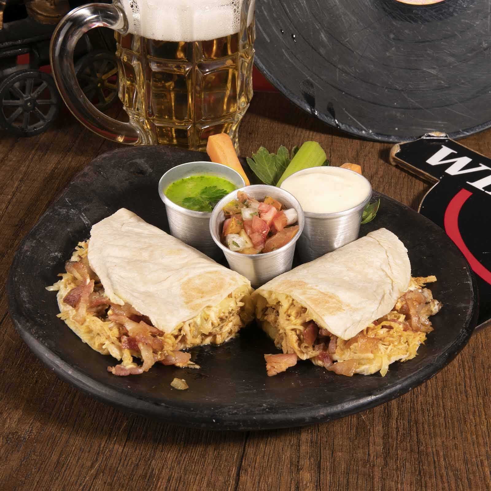 Tortilla, frijol refrito, queso mozzarella, pollo o res a elección, lechuga, guacamole, pico e gallo.