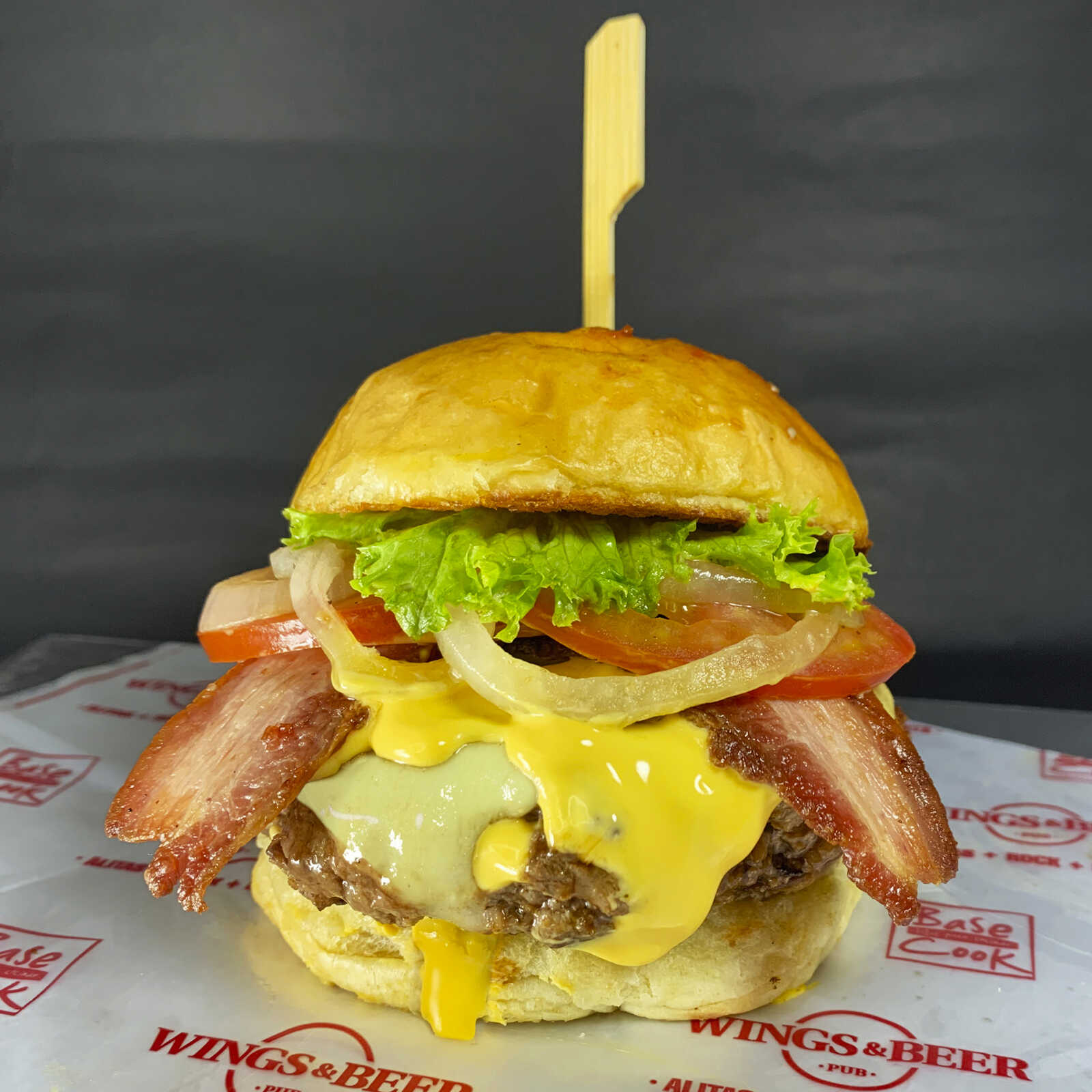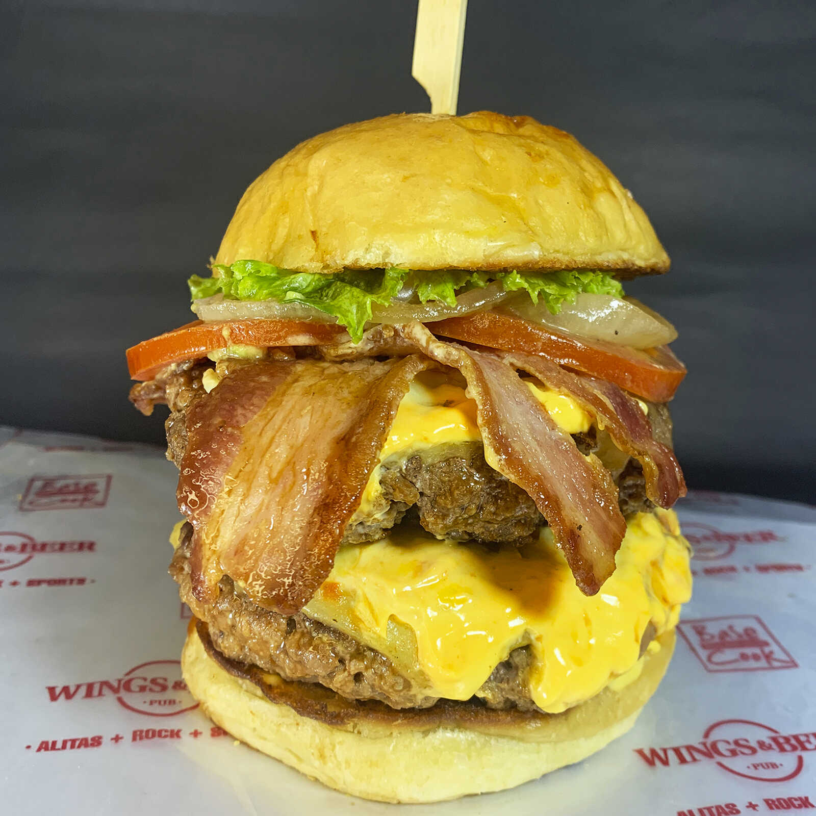 Pan artesanal, 2 carnes certified angus beef, vegetales, salsas, tocineta, queso mozzarella, queso cheddar, sin papa.