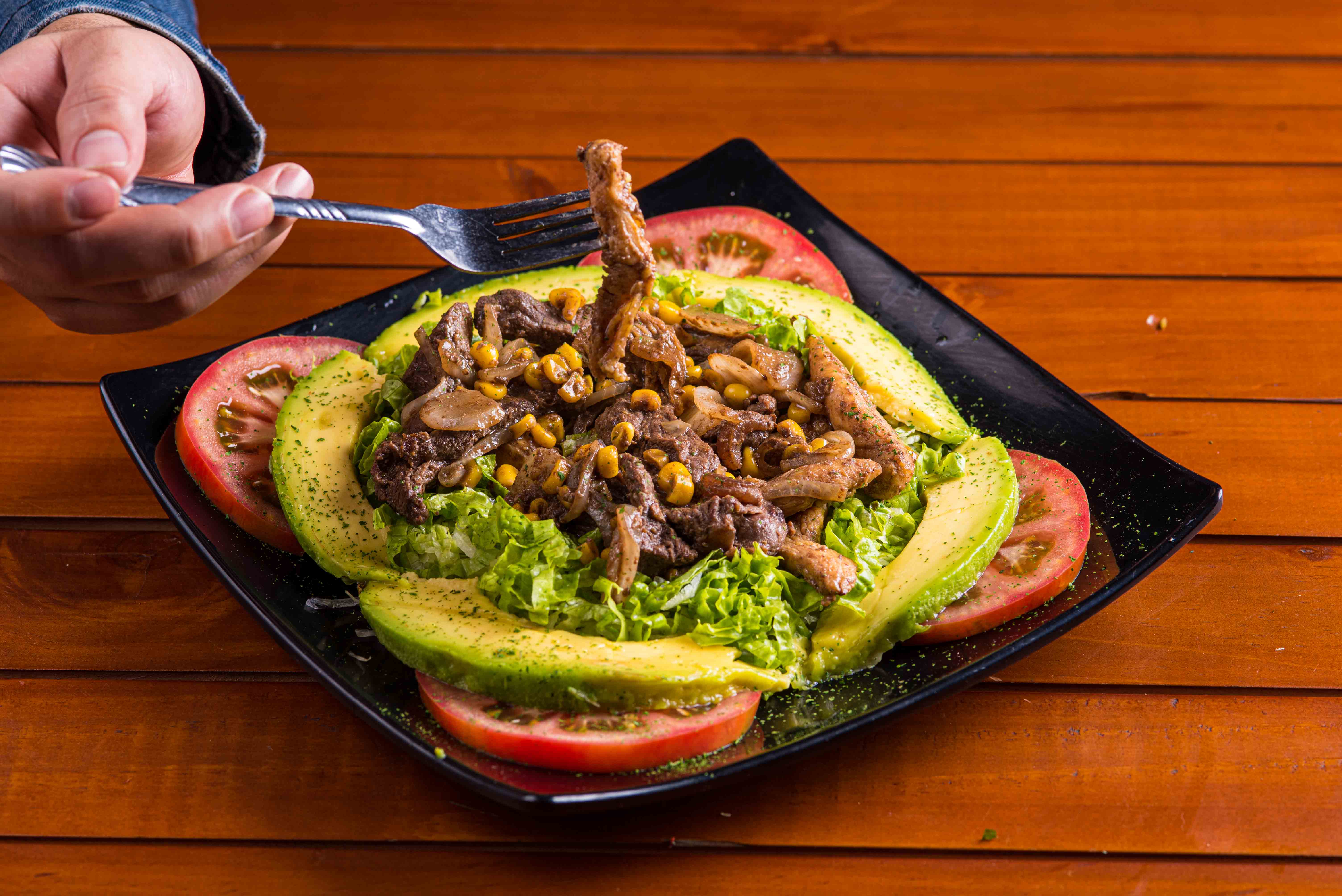 Mezcla de lechugas, julianas de pollo, lomo de res a la parrilla, maíz tierno, tomate, aguacate, cebolla, vinagreta de la casa.