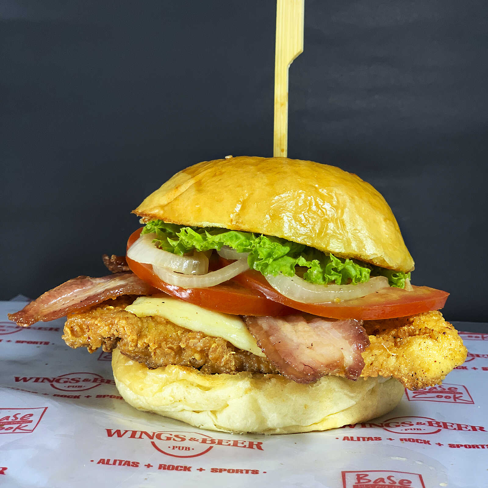 Pan tipo brioche, 100% pechuga crispi, tocineta, queso mozzarella, vegetales, sin papa.