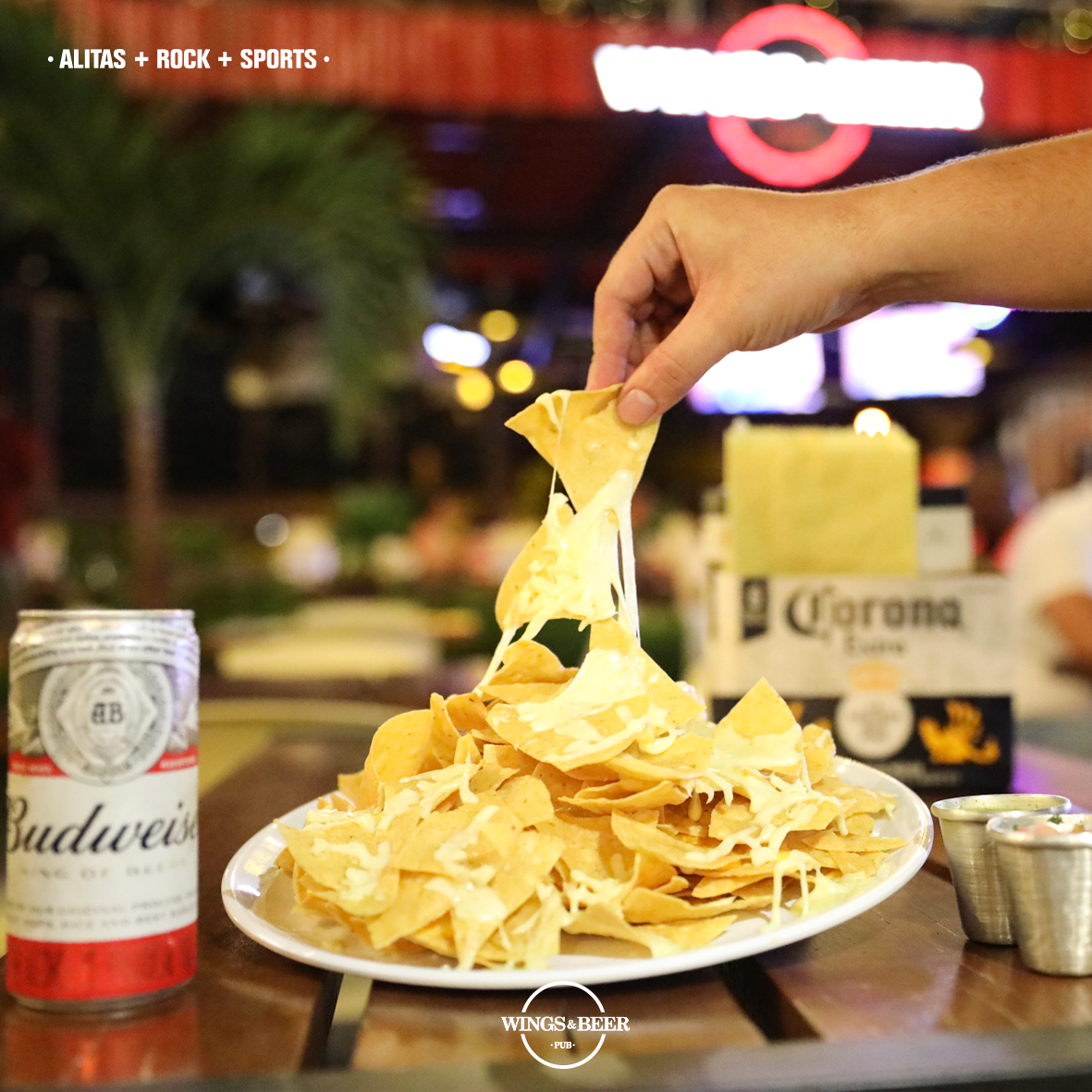 Nachos, queso cheddar, queso mozzarella, guacamole, sour cream.