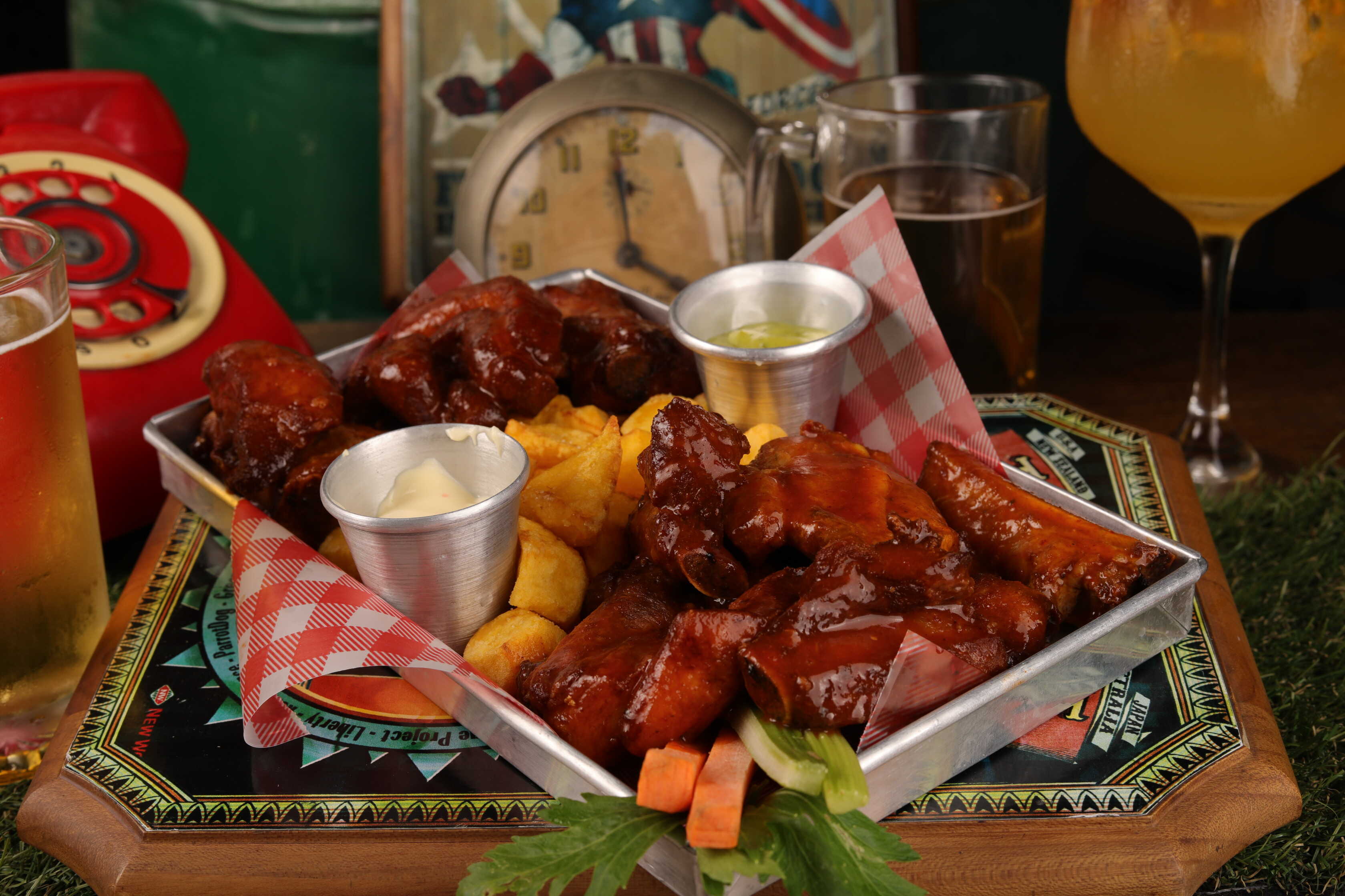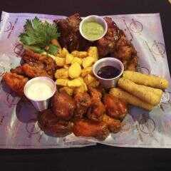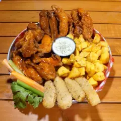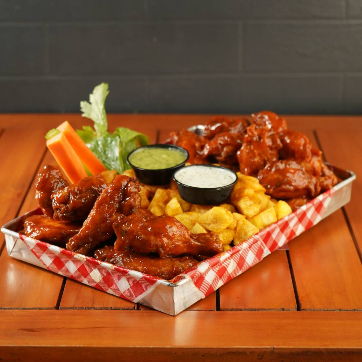 10 Piezas de Alitas, 150g de costilla, 4 cheese fingers, 3 canoas gratinadas, 10 boneless, papita criolla, apio, zanahoria, guacamole, sour cream y 2 salsas a elección.