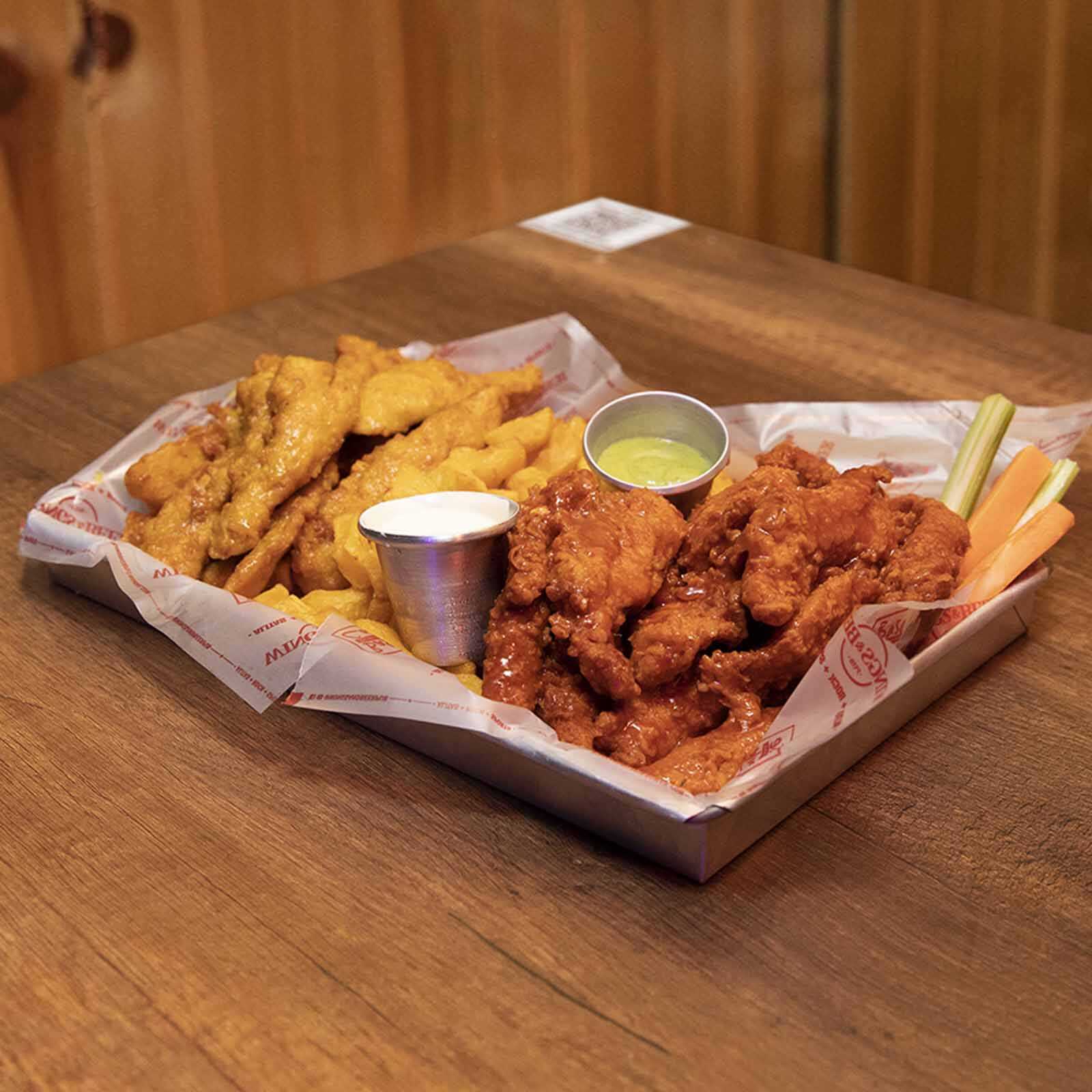10 Piezas de Alitas, 4 Boneless, 300g de Costilla, 4 cheese fingers, papita criolla, apio, zanahoria, guacamole, sour cream y 2 salsas a elección.