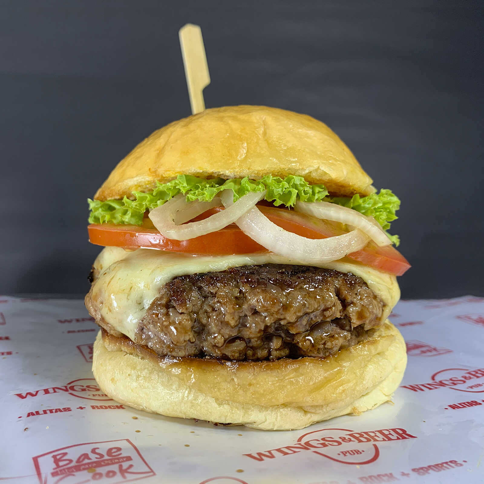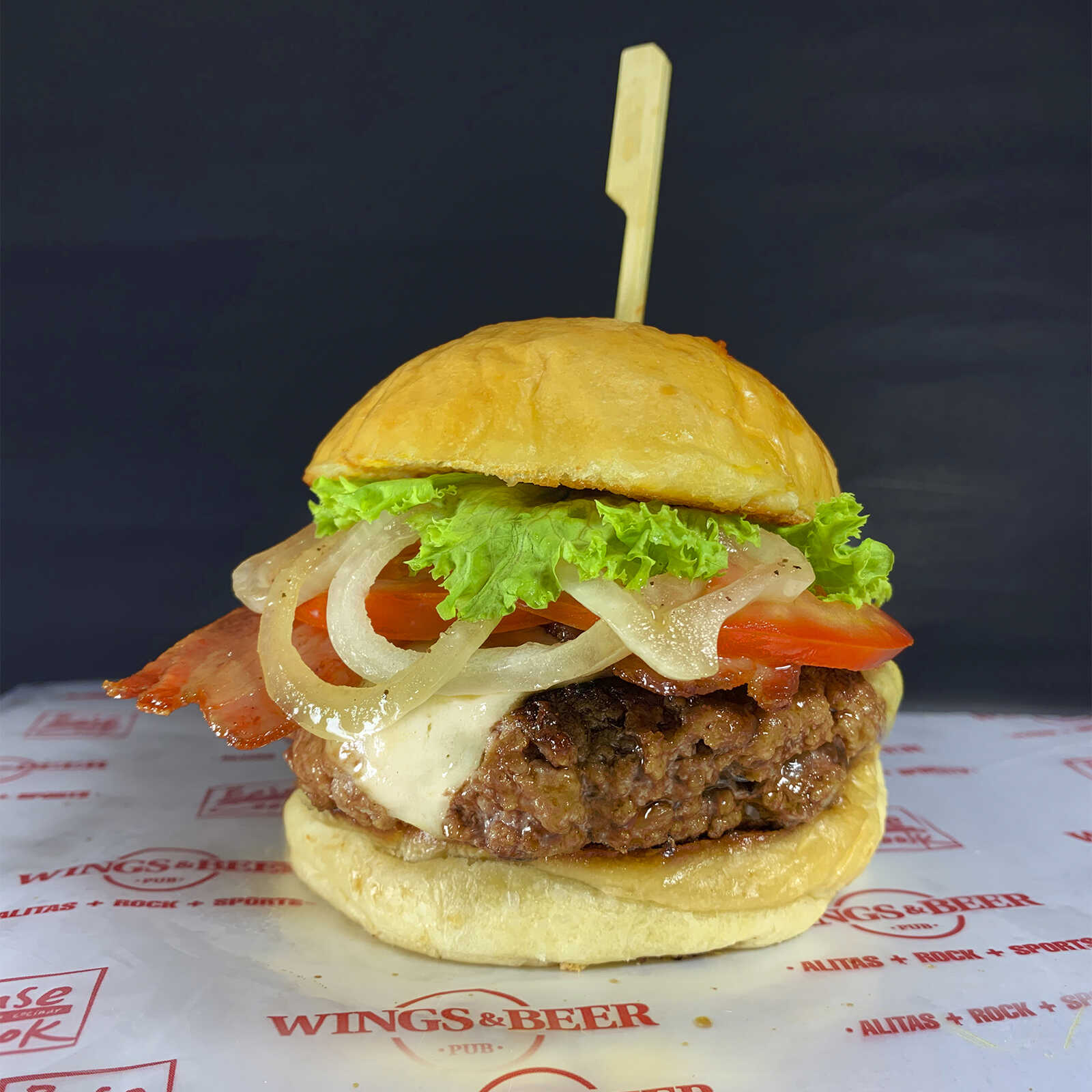 Pan Artesanal + Carne 100% Certified Angus Beef Braseada En Salsa De La Casa + 1 Pieza De Alita W&B + Queso Americano + Lechuga Crespa + Tomate + Cebolla + Mozzarella