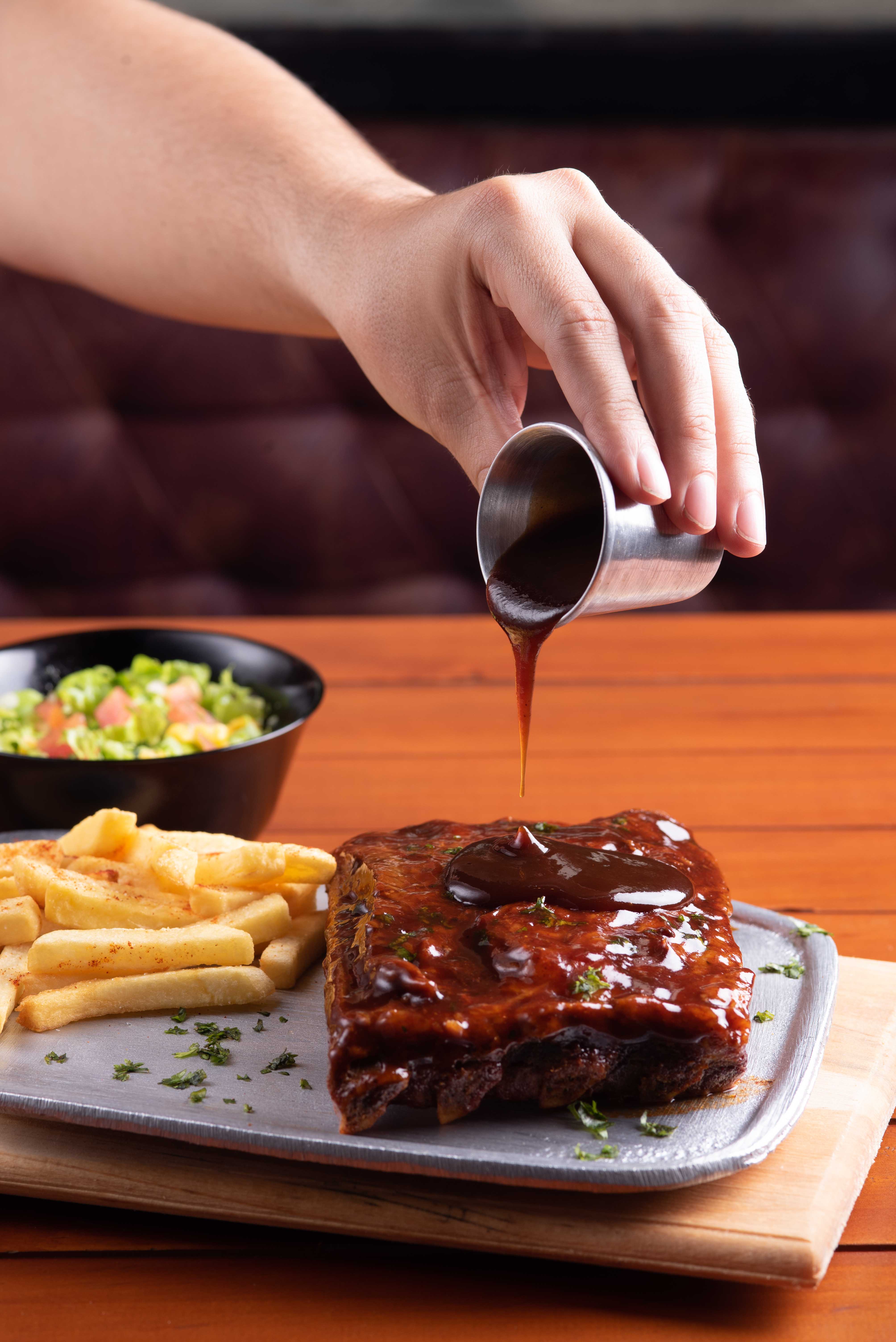 Rack de costilla americana asada y bañadas en nuestra salsa BBQ, papa a la francesa, apio, zanahoria.