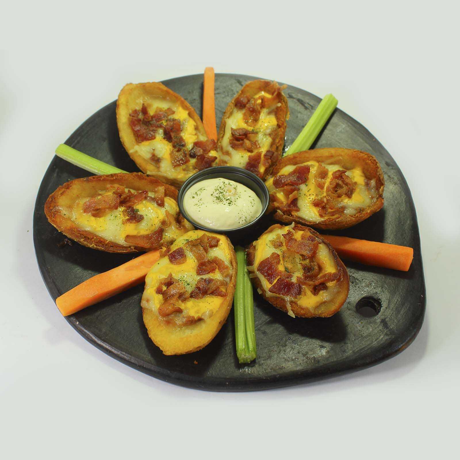 6 Canoitas de papa gratinadas, queso mozzarella, queso cheddar, tocineta, salsas de queso de la casa.
