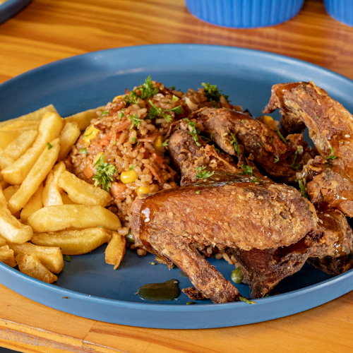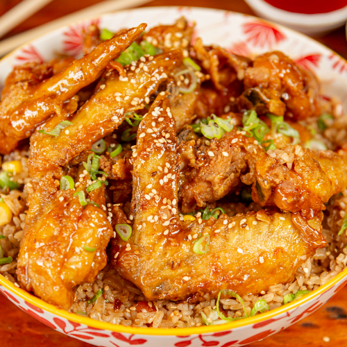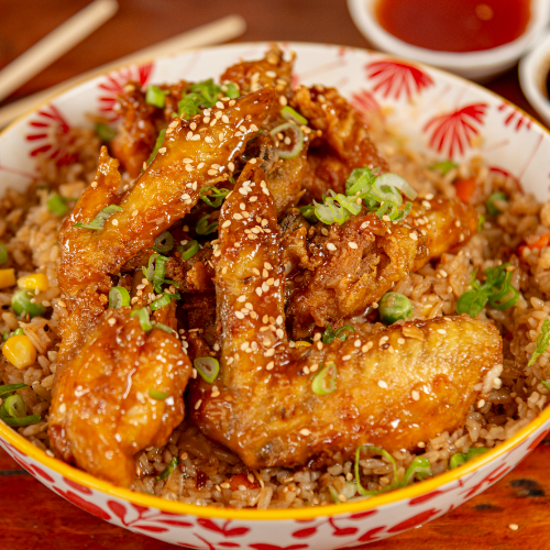 Delicioso combo con 2 alitas fritas bañadas con salsa a la naranja, acompañado de 200g de arroz oriental (vegetales: zanahoria, arveja, maíz, raíces chinas, cebollín) 100 g de papas fritas