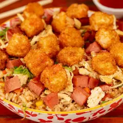 2 Arroz al wok (200 Gr C/U) con zanahoria, maíz, arvejas, salsa de soya, pollo desmechado, raíces chinas, cebollín + palmitos de cangrejo apanados
