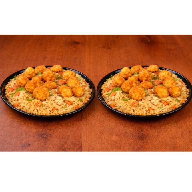 Arroz al wok con zanahoria, salsa soya, raíces chinas, cebollín (400gr) + trozos de pollo apanado bañados en salsa de naranja + 2 porciones de papas a la francesa (200gr)