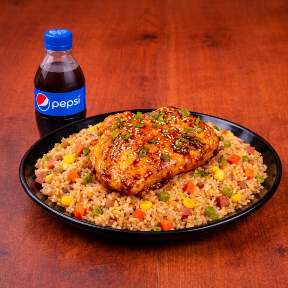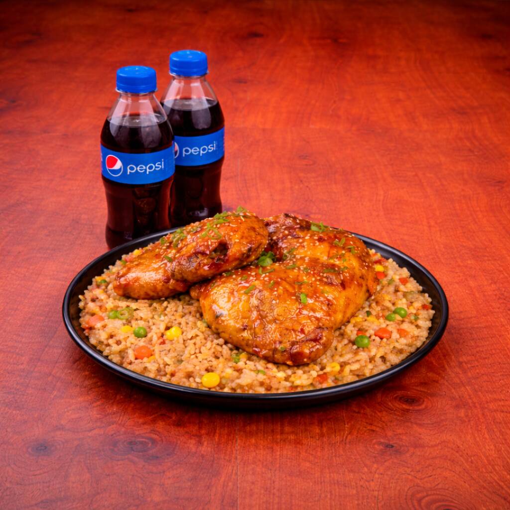 200 Gr de arroz al wok con zanahoria, salsa de soya, raíces chinas, cebollín + 1/4 de pollo (pierna pernil) en salsa de naranja + pepsi 250 ml gratis
