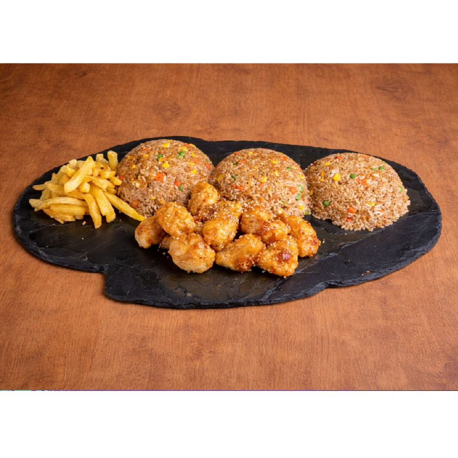 Arroz al wok con zanahoria, raíces chinas, cebollín, salsa soya (600gr) + trozos de pollo apanado bañados en salsa de naranja + 2 porciones de papas a la francesa (300gr)
