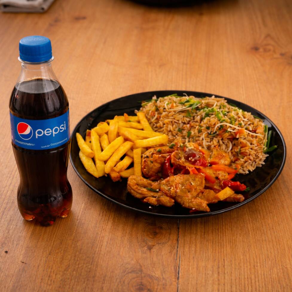 Combo arroz al wok (zanahoia, raices chinas, cebollín y salsa soja) +cerdo agridulce y verduras (Zukini, cebolla, zanahoria y salsas) + pepsi 250 ml. Acompañado con papas a la francesa