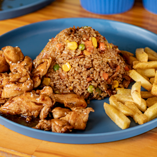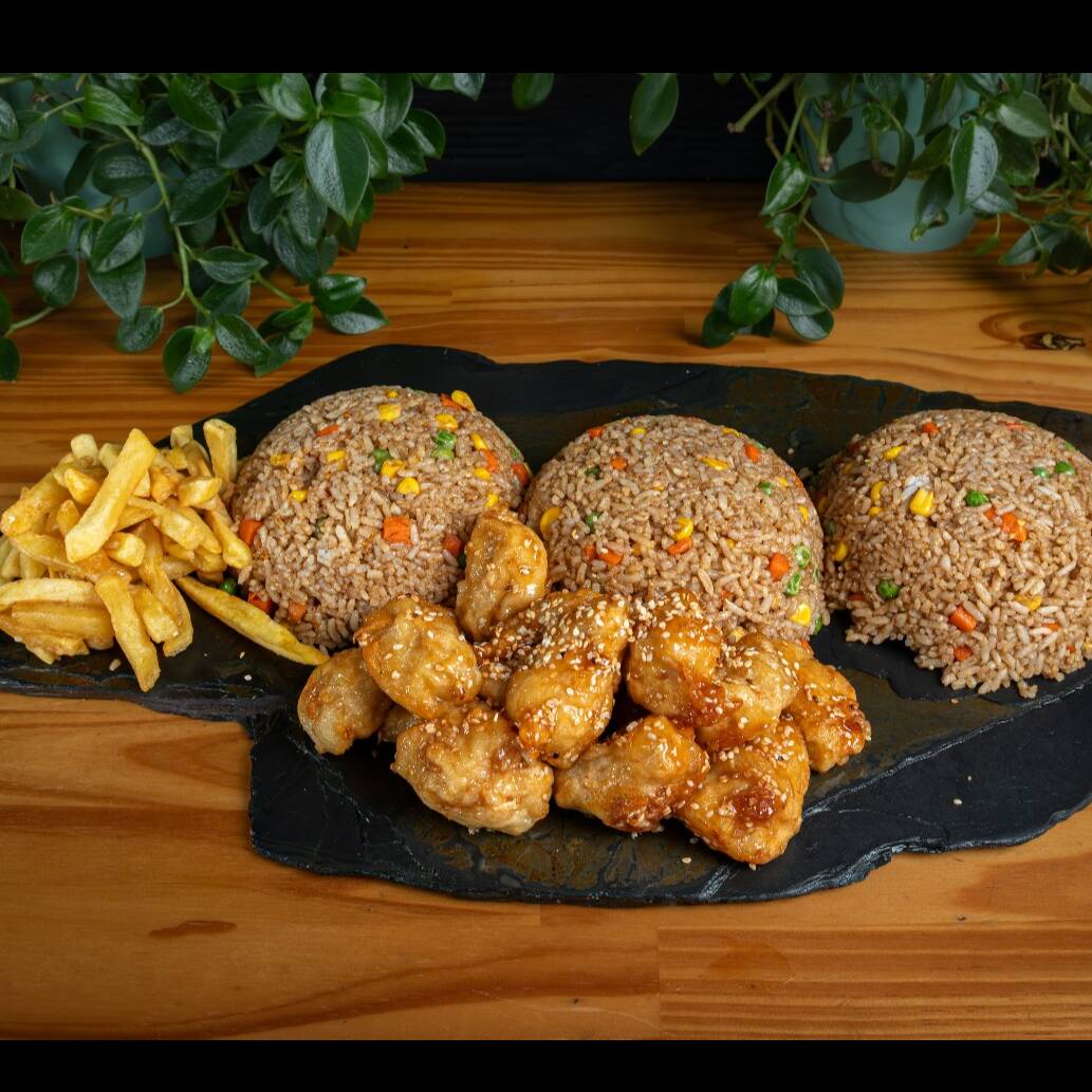 Arroz al wok con zanahoria, maiz, arbejas, salsa soya, jamón en cubos (600gr) + trozos de pollo apanado bañados en salsa de naranja + 2 porciones de papas a la francesa (300gr)