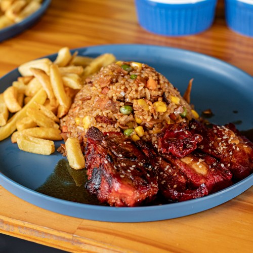 200 Gr de arroz al wok con zanahoria, maíz, arvejas, salsa de soya, raíces chinas, cebollín + 150 gr costilla ahumada + porción papa a la francesa.