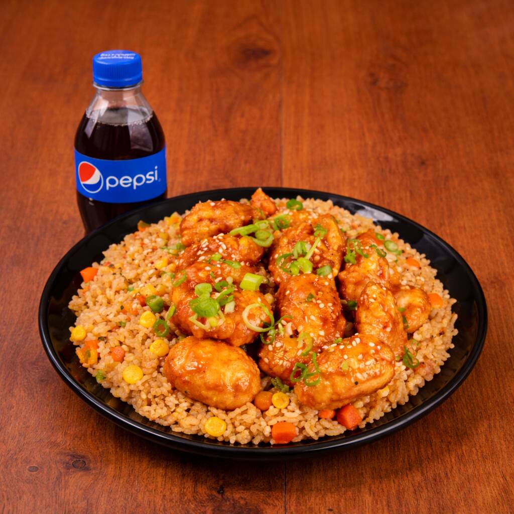 200 Gr de arroz al wok con zanahoria, salsa de soya, raíces chinas, cebollín + trozos de pollo apanados en salsa de naranja + Pepsi 250 ml