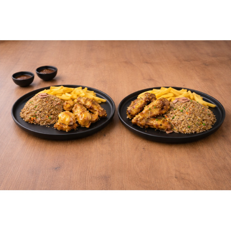400 Gr de arroz al wok con zanahoria, salsa de soya, raíces chinas y cebollín + 8 piezas de alitas en salsa de naranja + coca cola 250 ml gratis.