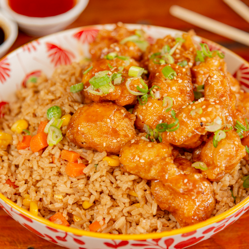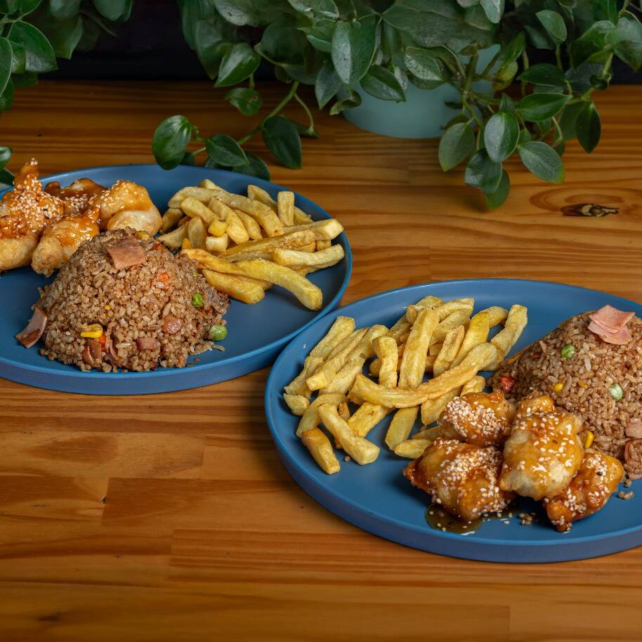 Arroz al wok con zanahoria, maiz, arbejas, salsa soya, jamón en cubos (400gr) + trozos de pollo apanado bañados en salsa de naranja + 2 porciones de papas a la francesa (200gr)