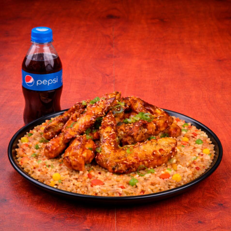 200 Gr de arroz al wok con zanahoria, salsa de soya, raíces chinas, cebollín + 4 piezas de alitas en salsa de naranja + pepsi 250 ml gratis