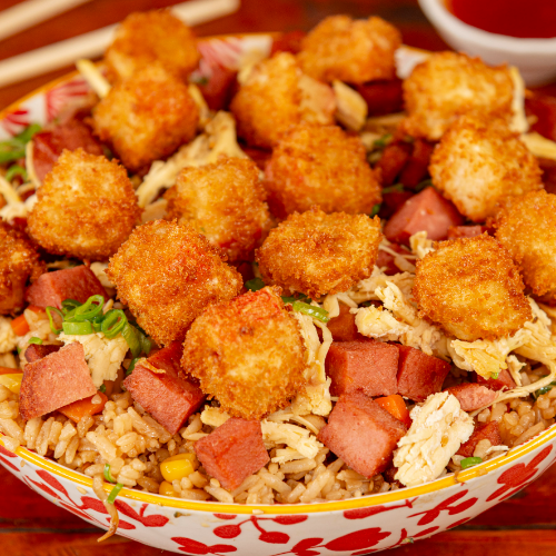 Delicioso combo con palmitos crispy, acompañado de 400 g de arroz oriental (vegetales: zanahoria, arveja, maíz, pollo desmechado, raíces chinas, cebollín) 200 g de papas fritas + 2 bebidas de la casa