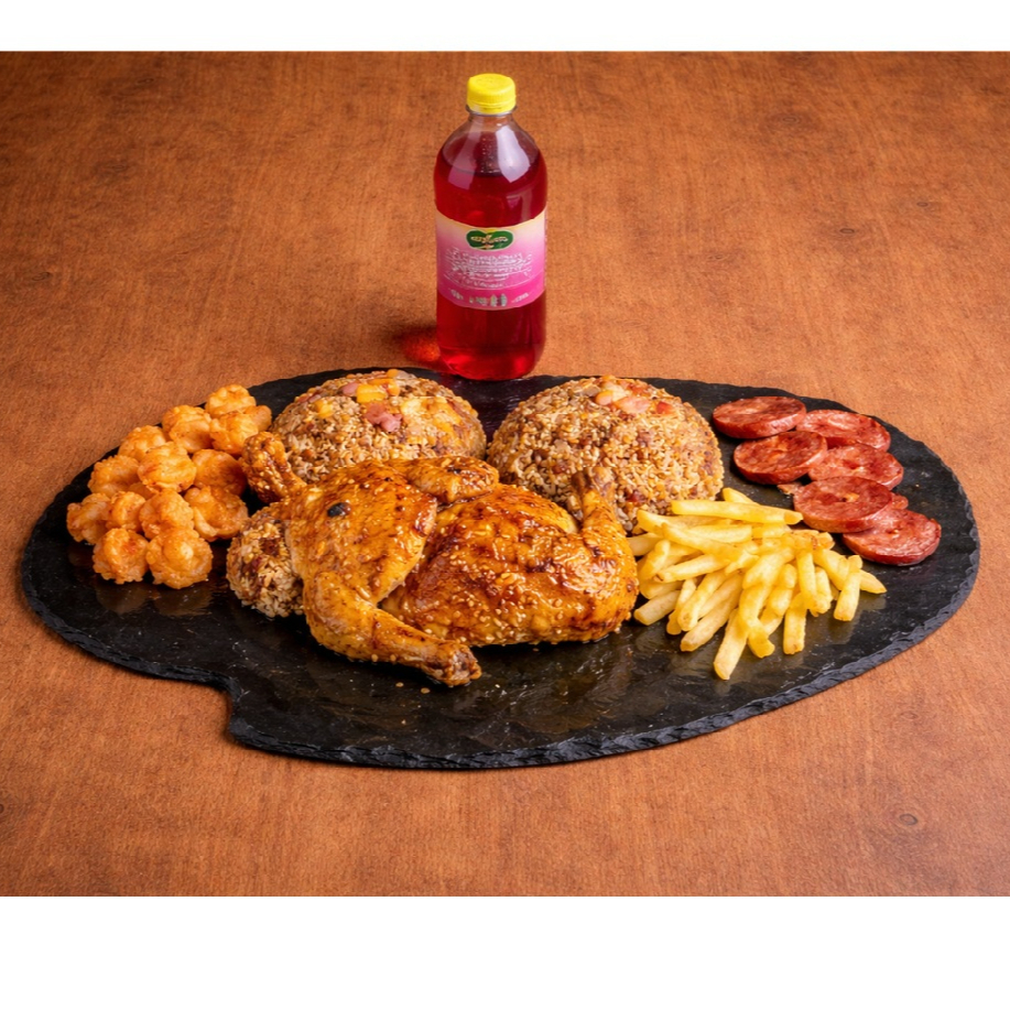 Super combo familiar: 1000g de arroz oriental (vegetales: zanahoria, raíces chinas, cebollín, salsa soya) + 1/2 pollo +320 g salchichón doradito + palmitos crispy + 400 g de papas fritas y gaseosa 1,5 postobón