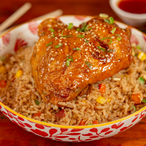 200 Gr de arroz al wok con zanahoria, maíz, arvejas, salsa de soya, raíces chinas, cebollín + 1/4 de pollo (pierna pernil) en salsa de naranja + coca cola 250 ml gratis