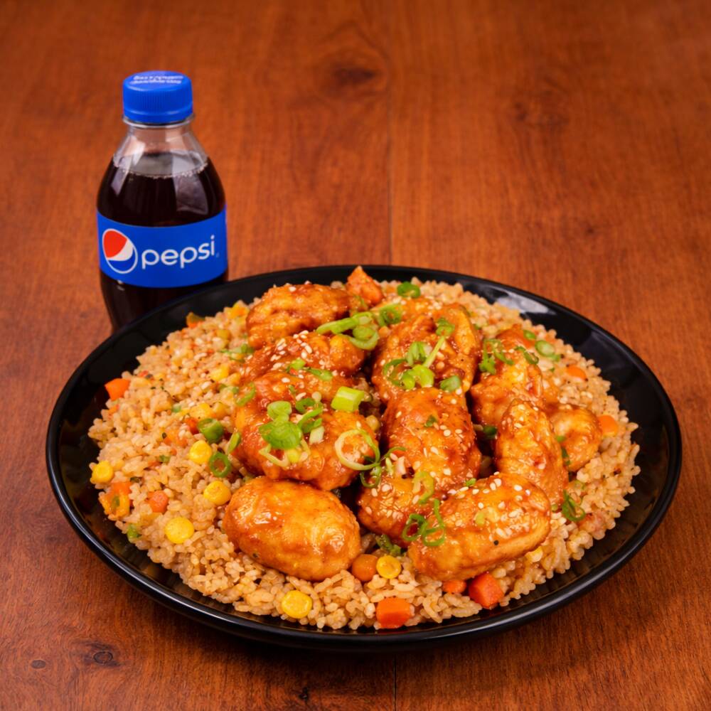 200 Gr de arroz al wok con zanahoria, salsa de soya, raíces chinas, cebollín + trozos de pollo apanados en salsa de naranja + pepsi 250 ml
