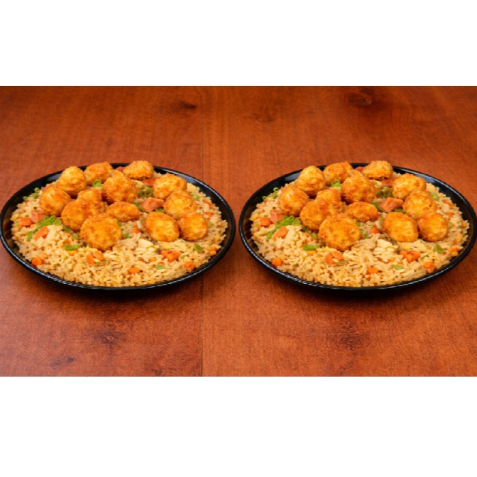 2 arroz al wok (200 gr c/u) con zanahoria, salsa de soya, pollo desmechado, raíces chinas, cebollín + palmitos de cangrejo apanados