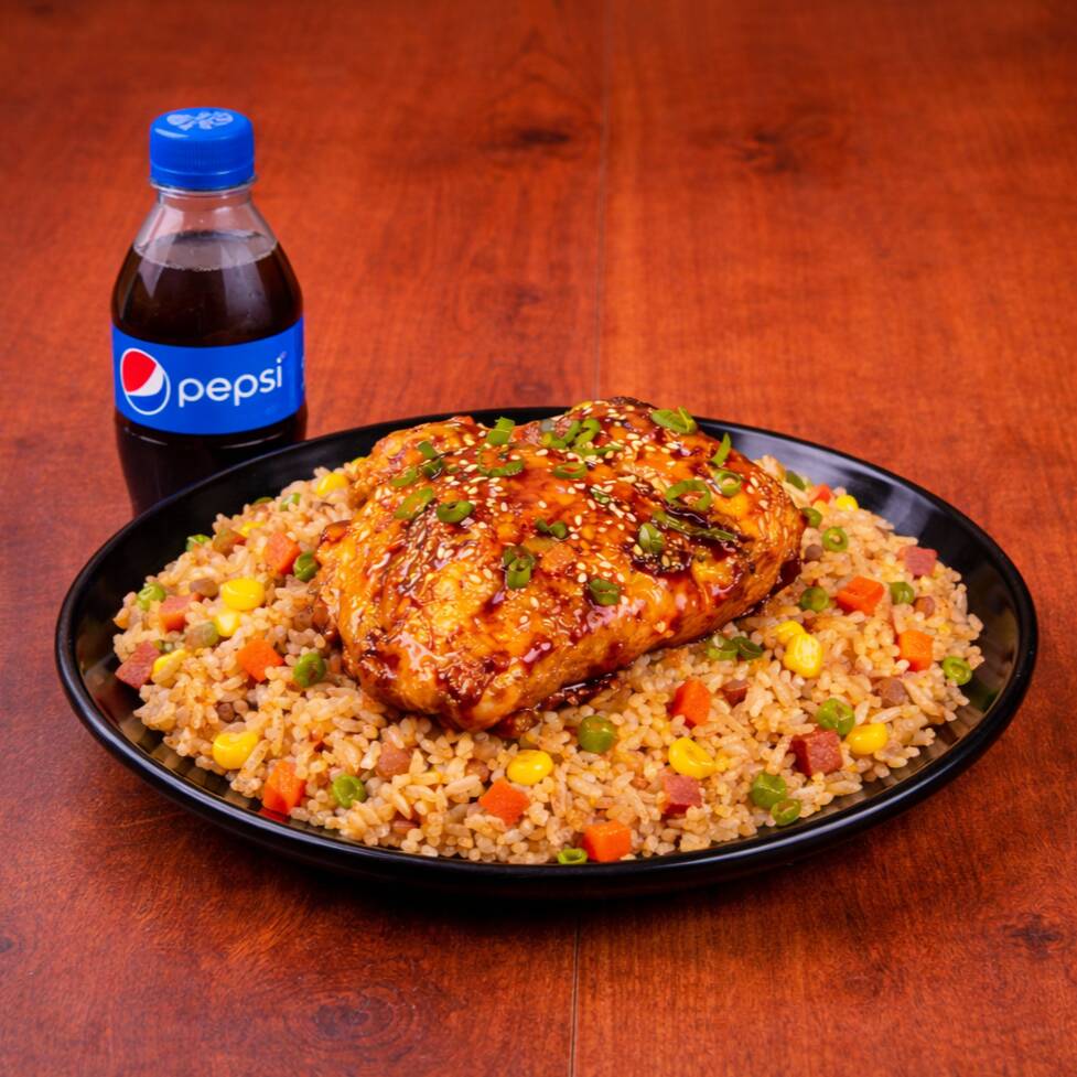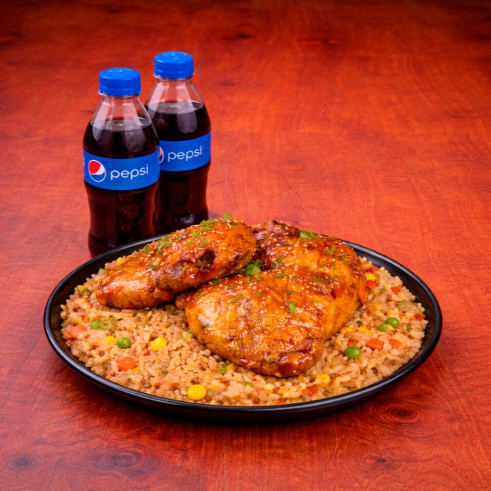 200 Gr de arroz al wok con zanahoria, salsa de soya, raíces chinas, cebollín + 1/4 de pollo (pierna pernil) en salsa de naranja + pepsi 250 ml gratis