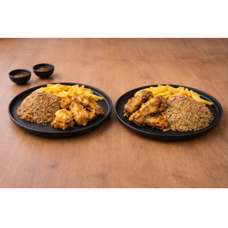 200 Gr de arroz al wok con zanahoria, salsa de soya, raíces chinas, cebollín + 120 gr trozos pollo en salsa teriyaki + porción papa a la francesa