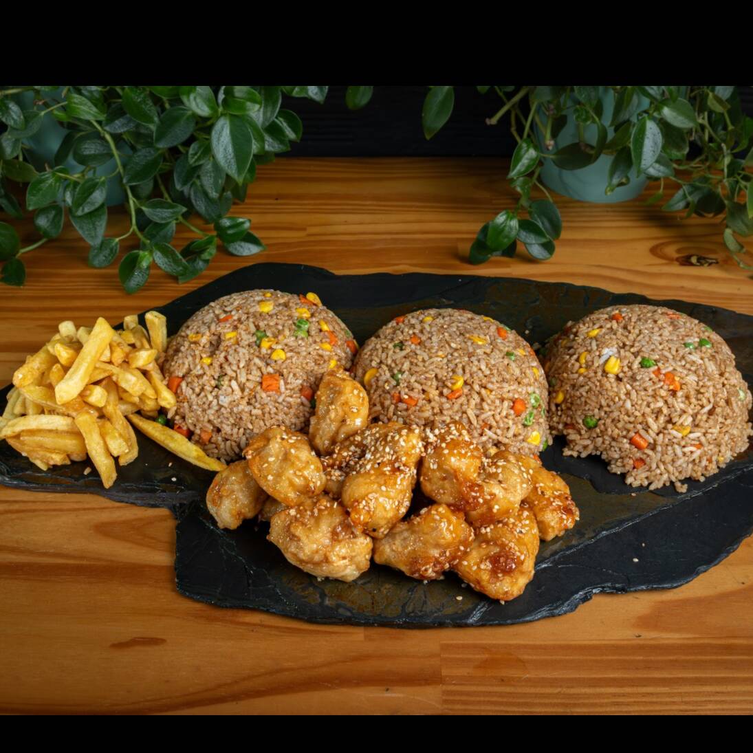 Arroz al wok con zanahoria, maiz, arbejas, salsa soya, jamón en cubos (600gr) + trozos de pollo apanado bañados en salsa de naranja + 2 porciones de papas a la francesa (300gr)