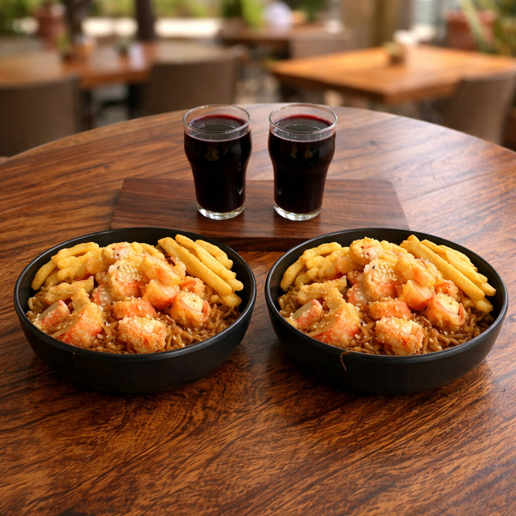 Combo arroz al wok (zanahoia, raices chinas, cebollín y salsa soja) +camarones al wok y verduras (Zukini, cebolla, zanahoria y salsas) + pepsi 250 ml. Acompañado con papas a la francesa