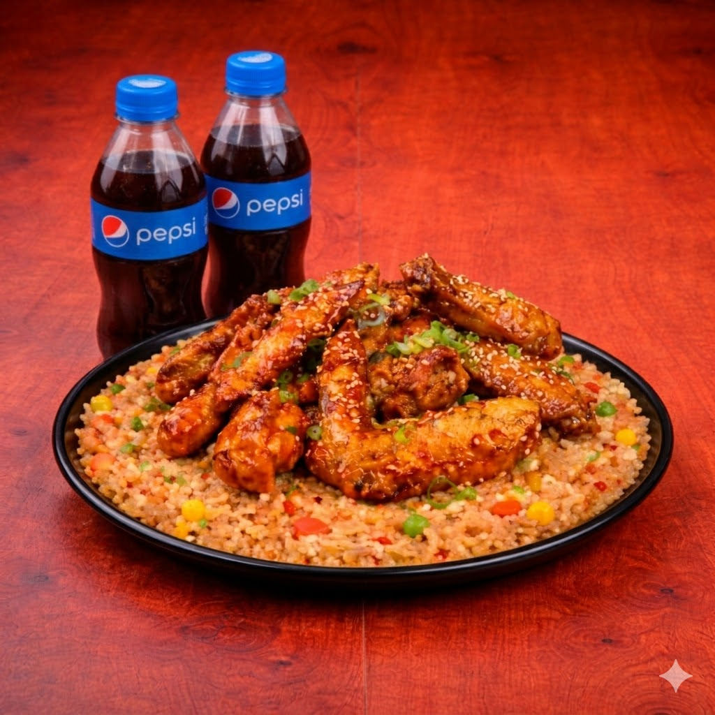 400 Gr de arroz al wok con zanahoria, salsa de soya, raíces chinas y cebollín + 8 piezas de alitas en salsa de naranja + 2 pepsi 250 ml gratis.