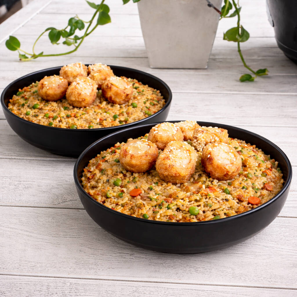 2 arroz al wok (200 gr c/u) con zanahoria, salsa de soya, raíces chinas, cebollín + palmitos de cangrejo apanados