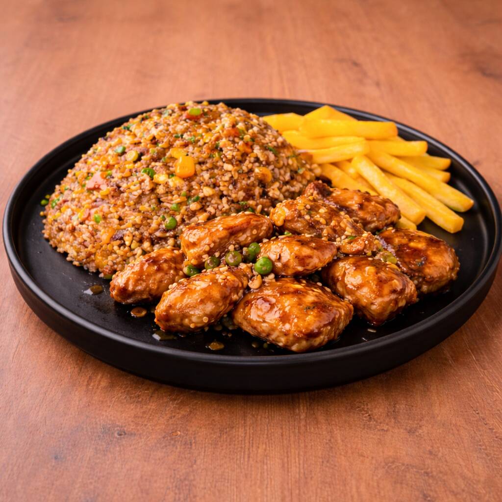 Arroz al wok con zanahoria, salsa soya, raíces chinas, cebollín (600gr) + trozos de pollo apanado bañados en salsa de naranja + 2 porciones de papas a la francesa (300gr)