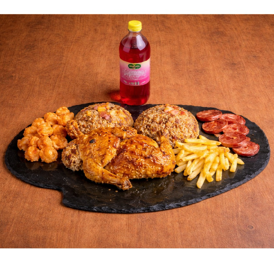 Super combo familiar: 1000g de arroz oriental (vegetales: zanahoria, raíces chinas, cebollín y salsa soya) + 1/2 pollo +320 g salchichón doradito + palmitos crispy + 400 g de papas fritas y gaseosa 1,5 postobón