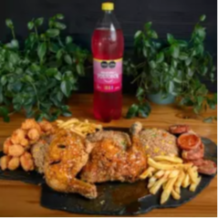 Super combo familiar: 1000g de arroz oriental (vegetales: zanahoria, arveja, maíz, raíces chinas) + 1/2 pollo +320 g salchichón doradito + palmitos crispy + 400 g de papas fritas y gaseosa 1,5 postobón