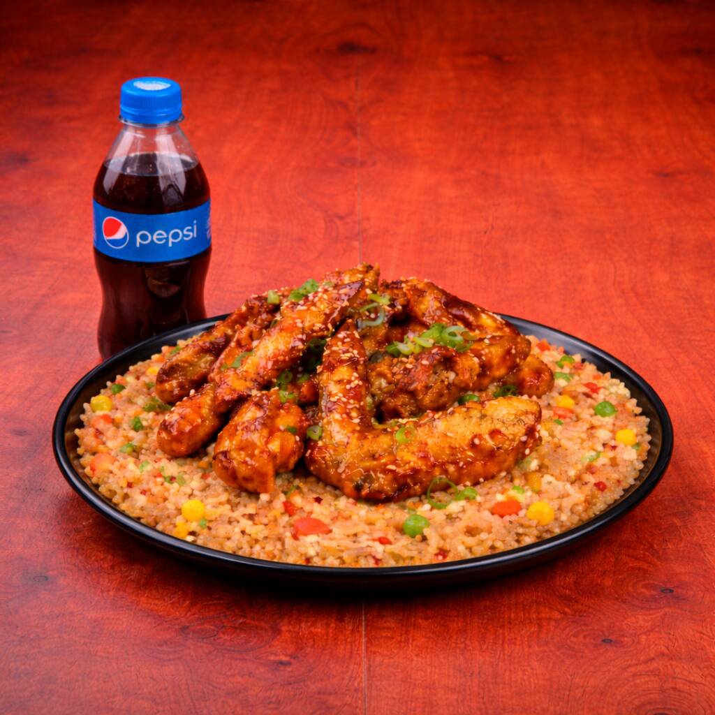 400 Gr de arroz al wok con zanahoria, salsa de soya, raíces chinas y cebollín + 8 piezas de alitas en salsa de naranja + pepsi 250 ml gratis.