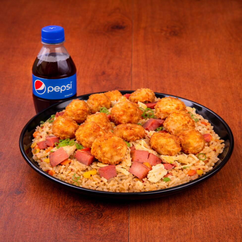 200 Gr de arroz al wok con zanahoria, salsa de soya, pollo desmechado, raíces chinas, cebollín + palmitos de cangrejo apanados + pepsi 250 ml gratis