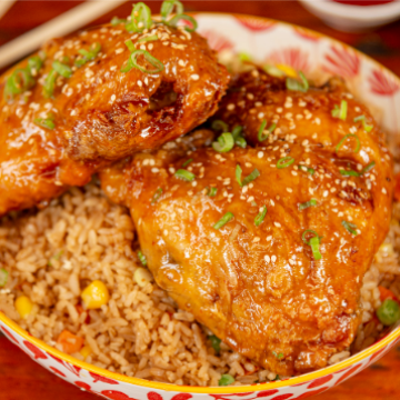 400 Gr de arroz al wok con zanahoria, maíz, arvejas, raíces chinas y cebollín+ 1/2 de pollo (2 pierna pernil) en salsa de naranja + 2 coca colas 250 ml gratis