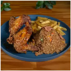 Delicioso combo con 2 alitas fritas bañadas con salsa a la naranja, acompañado de 200g de arroz oriental (vegetales: zanahoria, arveja, maíz, raíces chinas, cebollín) 100 g de papas fritas