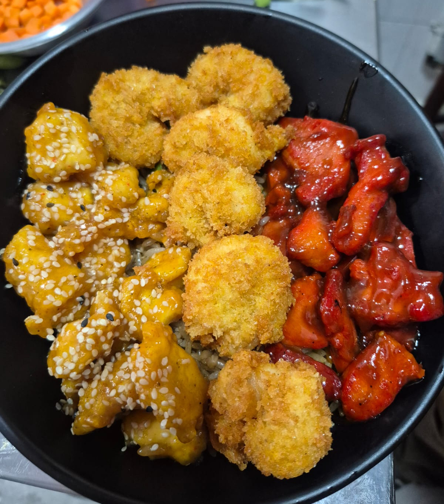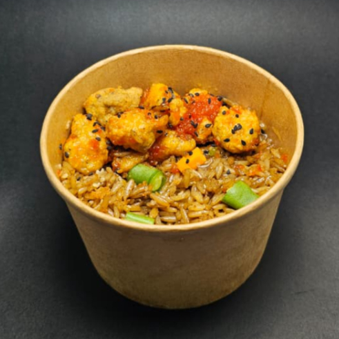 Delicioso pollo apanado envuelto de salsa de la casa de pimentón y ajonjolí negro y arroz fusión al wok 300 g.