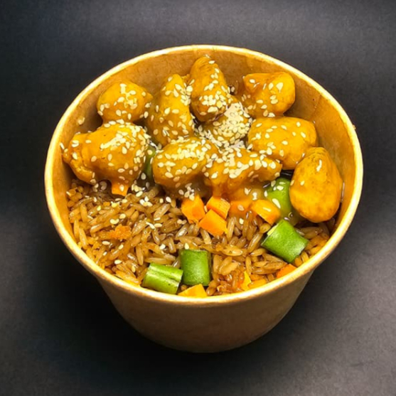 Delicioso pollo apanado envuelto de salsa de la casa de naranja y ajonjolí y arroz fusión al wok 300 g.